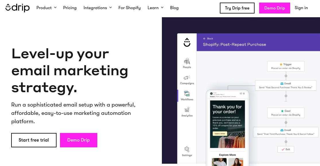 Drip’s e-commerce CRM is designed for those who need to convert and retain customers at a high rate. It excels in personalization and behavioral targeting, integrating deeply with e-commerce platforms to leverage consumer data for personalized email outreach.