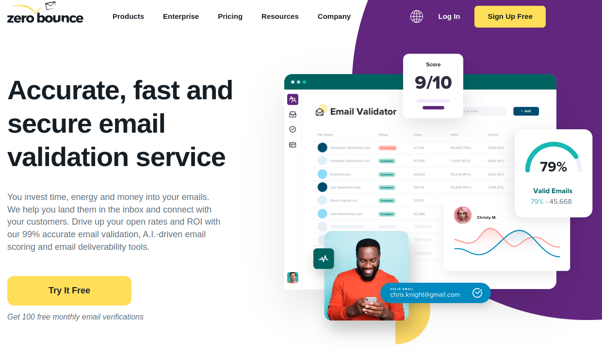 ZeroBounce is an accurate, fast, and secure email validation service that helps you maximize the success of your email marketing efforts. With a 99% accuracy rate, it's advanced technology verifies the validity of email addresses, ensuring that your messages reach real and engaged recipients. Zerobounce's lightning-fast validation process saves you time and allows you to focus on creating compelling content.