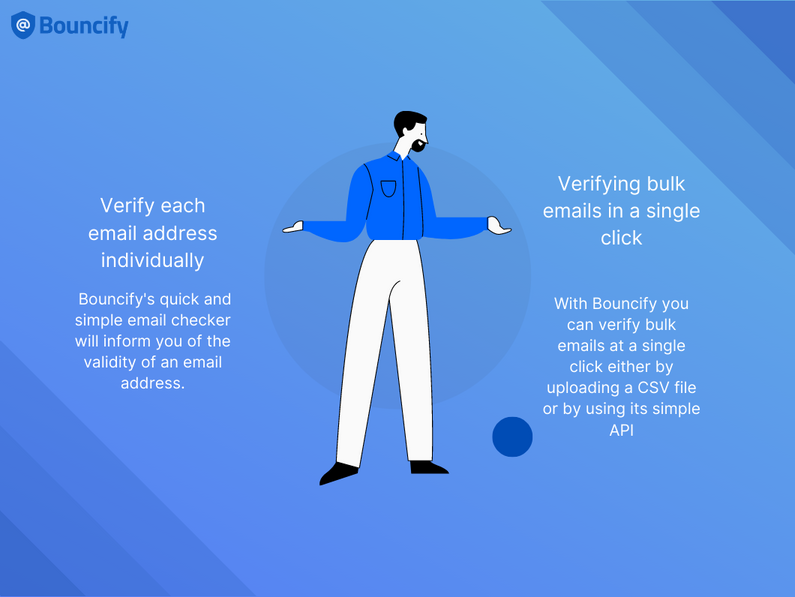You can validate bulk email addresses using the majority of email verifying services. Finding a tool that confirms your email address automatically is crucial. Bouncify will help you to check bulk emails at a single click either by uploading a CSV file or by using its simple API. Bouncify assures you fast verification with 99% accuracy. Thus, each email address of your lists will be verified with guaranteed accuracy in a very short time.