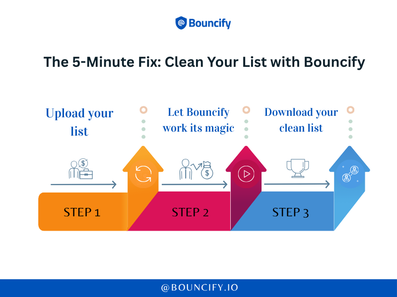 - Let Bouncify work its magic. We check every single email for typos, risky domains, and inactive accounts—all without ever sending a single email.